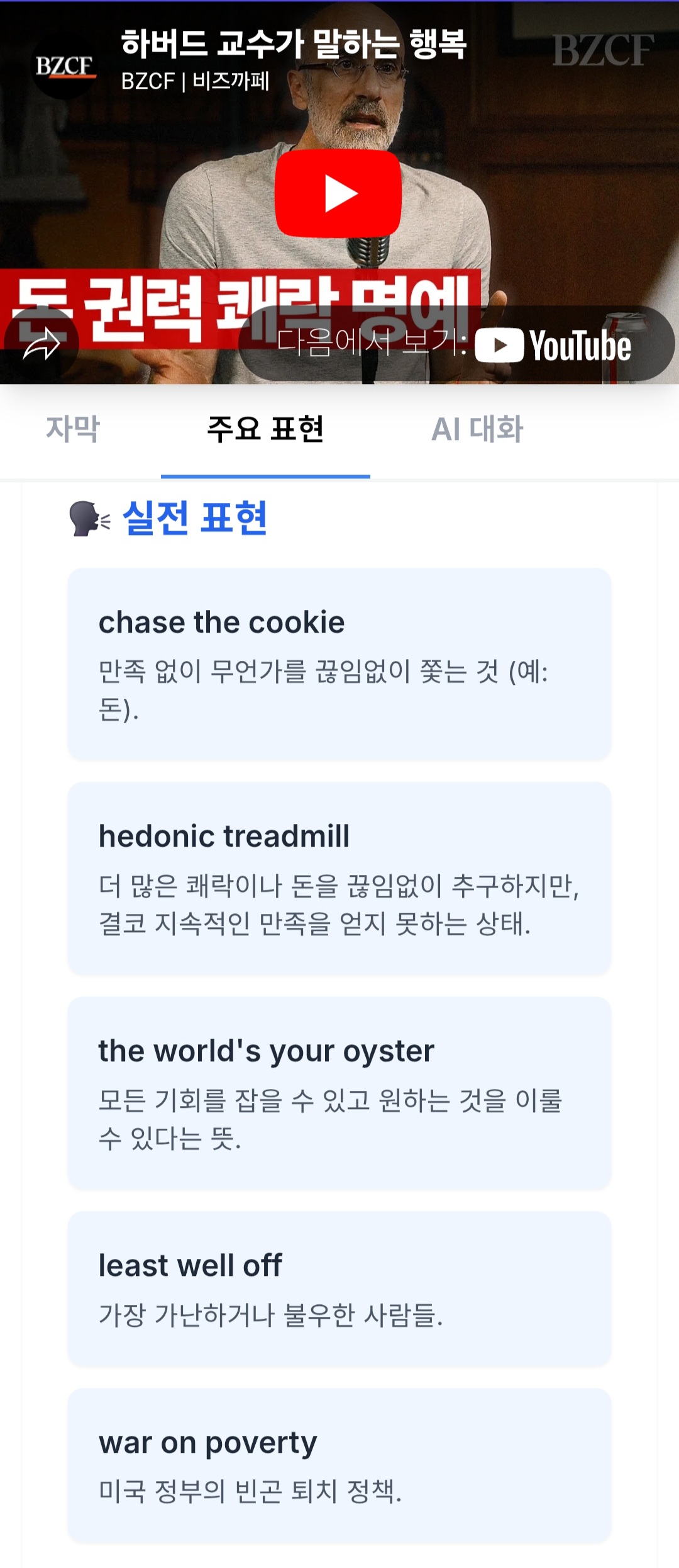 '행복은 돈으로 살 수 없어'라는 말, 다들 들어보셨을 거예요. 진정한 행복에 대해 말할 수 있는 풍부하고 원어민다운 표현을 알려드릴게요예를 들어, 돈을 쫓는 삶의 허무함을 "just chasing the cookie"라고 표현하는 것처럼 말이죠.오늘은 바로 이 '진정한 만족'에 대한 깊은 통찰을 담은 하버드 교수의 강연 영상을 통해 교과서 밖 진짜 영어를 소개해 드리려 합니다. 돈이 아닌 다른 곳에서 행복을 찾는 지혜를 배우면서, 동시에 '만족'과 관련된 찰떡같은 영어 표현까지 한 번에 배워봐요!자, 그럼 이제 이 흥미로운 영상을 통해 우리가 얻을 수 있는 '진짜 영어' 표현들을 자세히 살펴볼까요?[영상 요약] 하버드 교수의 강연은 돈이 진정한 만족을 가져다주지 않는다는 보편적인 메시지를 넘어서, 진정..