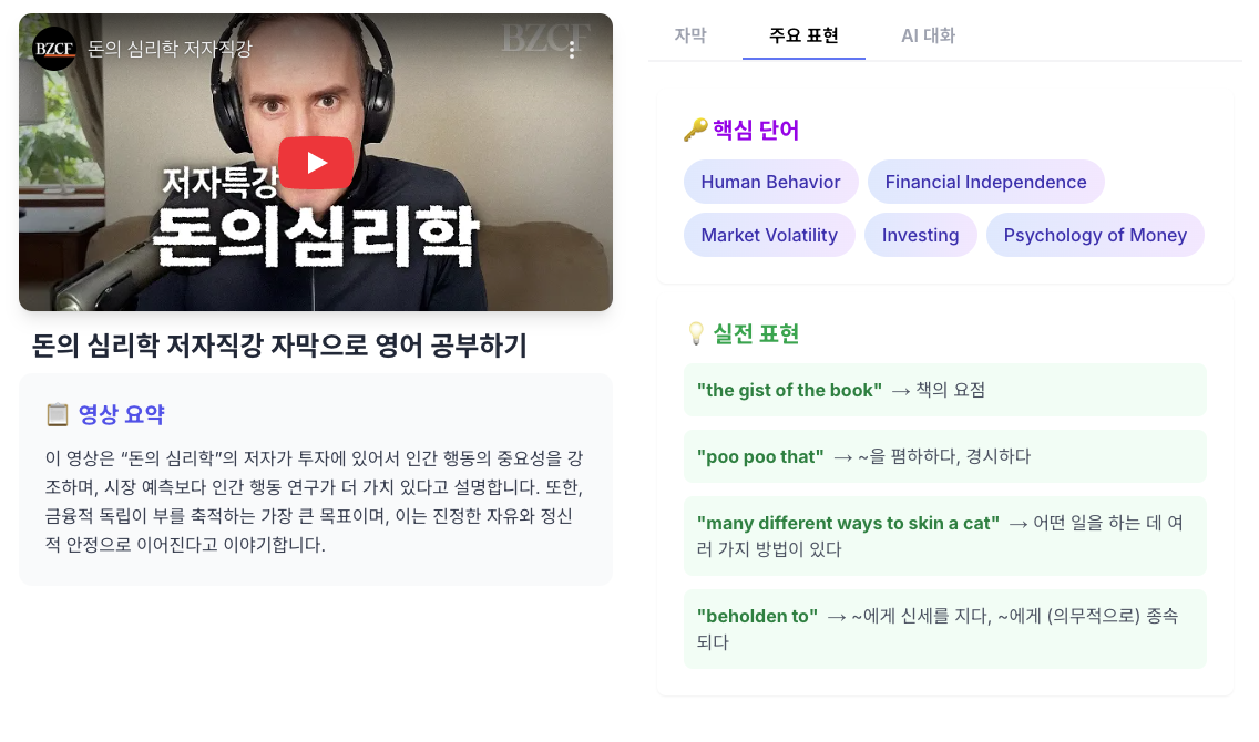 영어 공부, 언제까지 똑같은 주제로 하실 건가요?"Hi, I'm fine, thank you. And you?"공항에서 길을 묻고, 레스토랑에서 음식을 주문하는 영어… 물론 중요하죠. 하지만 솔직히 조금 지겹지 않으세요? 내 관심사와는 동떨어진 주제로 공부하려니 동기부여도 잘 안되고요. 만약 내가 정말 궁금해하는 '부자 되는 법', '투자 잘하는 법'에 대한 이야기를 들으며 영어를 배울 수 있다면 어떨까요? 그것도 베스트셀러 작가의 깊은 통찰이 담긴 인터뷰를 통해서 말이에요. 오늘은 바로 그런 분들을 위해 특별한 영상을 가져왔습니다. 세계적인 베스트셀러 "돈의 심리학"의 저자 모건 하우절이 직접 출연해 책의 정수를 이야기하는 인터뷰인데요. 돈에 대한 지혜는 물론, 지적인 원어민들이 사용하는 고급 표현까지..